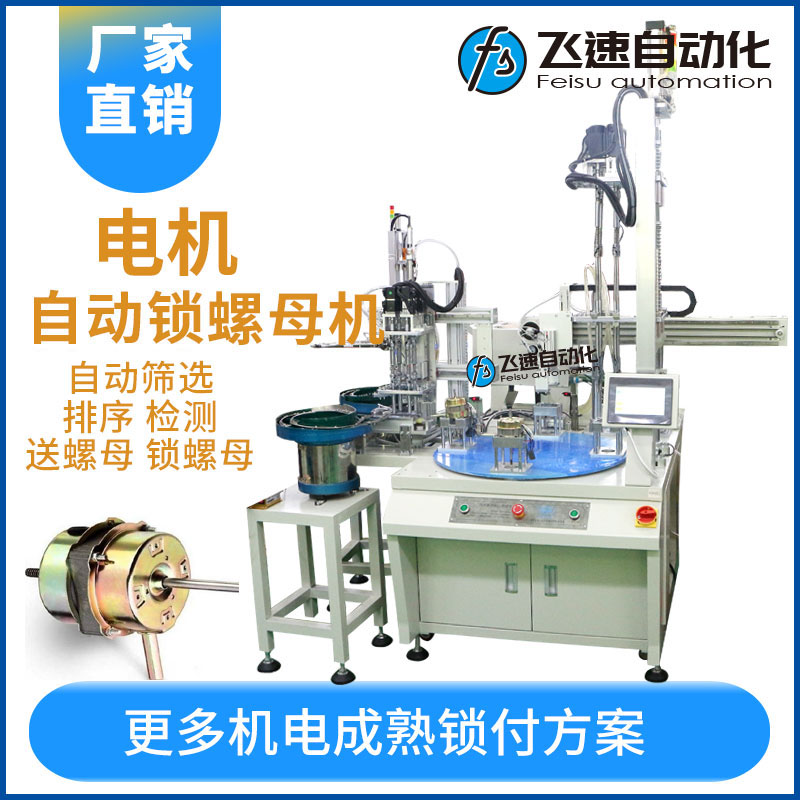 - 產(chǎn)品簡介: 風(fēng)扇電機自動鎖螺母機自動送螺母、擰螺母、取產(chǎn)品均由設(shè)備自動完成。 電機風(fēng)扇是一種具有風(fēng)扇轂和葉片的電機,其作用是產(chǎn)生驅(qū)動轉(zhuǎn)矩的動力源,風(fēng)扇電機主要由外殼、設(shè)于外殼內(nèi)的轉(zhuǎn)子、固設(shè)于外殼內(nèi)壁上且繞轉(zhuǎn)子設(shè)置的定子及端蓋組成。在組裝生產(chǎn)種需要用的五金標(biāo)準(zhǔn)件之一的螺絲進行安裝緊固,廠家生產(chǎn)一直都是傳統(tǒng)人工進行手工產(chǎn)品進行裝配一枚一枚螺絲擰緊或者采用一種電動螺絲刀來操作,在生產(chǎn)上不僅勞動強度大,生產(chǎn)效率低,而且在擰緊工件時無法控制力度,出現(xiàn)旋緊力不均或者容易滑牙等問題造成不良產(chǎn)品。 為此廠家會選購一臺自動化螺絲機來代替繁瑣的工作和提高工作效率 質(zhì)量等,飛速自動化生產(chǎn)的轉(zhuǎn)臺式多軸自動鎖螺絲機,設(shè)備配置了一個轉(zhuǎn)臺多個工位操作,設(shè)備上配置了兩臺振動盤自動定向排序的送料設(shè)備,其工作目的是通過振動將螺絲自動有序定向排列整齊、準(zhǔn)確地輸送到轉(zhuǎn)臺操作工位上然后由四軸把螺絲放置在配置好的工件上進行轉(zhuǎn)動扭緊螺絲釘,將擰好螺絲的產(chǎn)品由機械手自動送入出料倉,人工無需再去取產(chǎn)品,個過程都通過轉(zhuǎn)盤同時進行,各工位互不干擾,設(shè)備優(yōu)勢在于減少人工作業(yè)量,工人放置產(chǎn)品即可,送螺母、擰螺母、取產(chǎn)品均由設(shè)備自動完成。